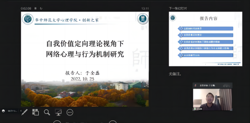 本次讲座由太阳成集团tyc122ccvip、社科处共同举办。华中师范大学硕士生导师于全磊博士应邀作了题为《自我价值定向理论视角下的网络心理与行为机制研究》的学术报告。报告采用线上方式进行,由心理学系主任张睆副教授主持,经理张潮教授、副经理郑晓俊博士出席。心理学专业教师、研究生和本科生200余人聆听了报告。