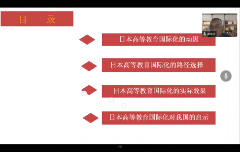 李德显教授的报告主要分为四个部分:第一部分从国际政治经济格局客观驱动、参与国际教育服务竞争的内在需求、日本人口出生率低和破解国际教育交流困局的必然选择四个方面阐述了日本高等教育国际化的动因。第二部分介绍了日本高等教育国际化的路径选择,即通过构建国际化课程体系、健全职工服务体系、多渠道完善保障机制和构建高等教育网络四个方面实现日本教育国际化。第三部分介绍了日本高等教育国际化的实际效果,阐释了四个方面路径选择对应的具体实施效果。第四部分提出对我国高等教育国际化的启示。报告结束后李教授仔细回应了师生的问答。