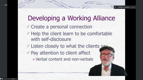 开幕式之后,Scott T. Meier教授做了题为“The Role of Client Narratives in Counseling and Psychotherapy”的主题报告,详细介绍了叙事在心理咨询和治疗中的作用。Scott T. Meier教授就任于美国纽约州立大学布法罗分校,专业及研究重点主要集中于临床与职业咨询、心理健康、心理测量学等,曾参与过纽约州立大学阿尔巴尼分校(SUNY Albany)教育心理学课程评估,并在美国教育研究协会、第三十八届心理治疗整合探索协会年会上发表多篇文章。