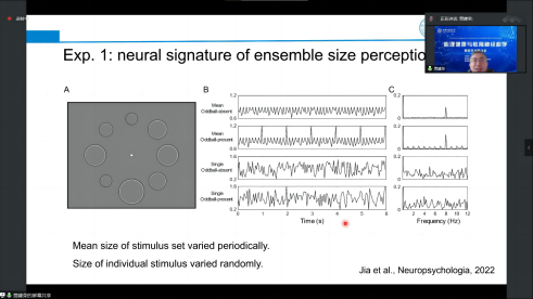 杭州师范大学认知与脑疾病研究中心副研究员贾建荣博士做了题为“Nonadditive integration of visual information in ensemble representation”的报告,介绍了应用图像分析技术取得的最新研究成果。贾建荣博士的研究工作主要聚焦于结合心理物理学实验和脑电/脑磁技术等探究视知觉、注意、工作记忆以及相关精神疾病的机制等方面。