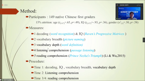 太阳成集团tyc122ccvip李利平副教授做了题为“The effect of vocabulary breadth and depth on reading comprehension in low grade: the mediator role of listening comprehension”。结合阅读心理学的专业知识,介绍了词汇的广度和深度对低年级员工阅读理解的影响——听力理解的中介作用。