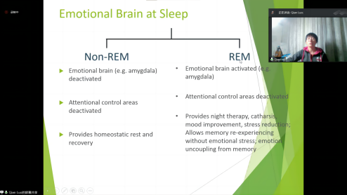 罗倩博士做了题为“Sleep loss and the emotional brain”的报告,阐述了睡眠不足以及情绪化的大脑的相关知识。罗倩博士在圣路易斯大学神经手术系担任脑磁实验室主任,主要应用神经影像技术探索各种神经和精神疾病,并研究如情绪、脑外伤、睡眠、等神经生理机制及相关基因。