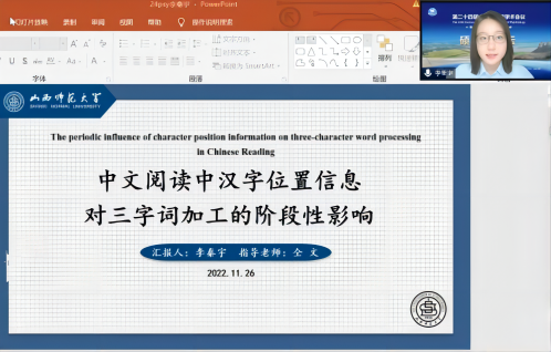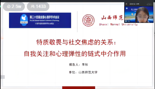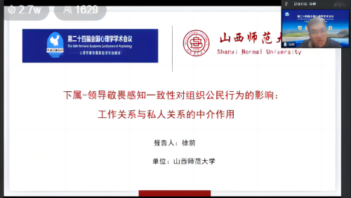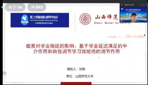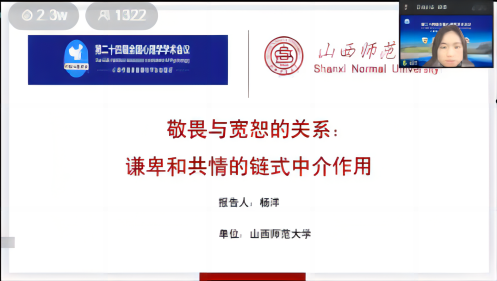 公司研究生学子在本次大会上作学术交流、精彩报告,报告内容丰富、精彩纷呈。公司张潮教授主持了“积极心理学专业委员会”专题研讨会2,心理系教师仝文博士主持“眼动心理研究专业委员会口头报告”,谭秀娟在博士论坛-发展与教育心理学作主题报告,参与本次大心理学大会口头报告的研究生10余名,参与心理学大会展贴报告的研究生10余名。观看本次心理学大会的校内外师生共计300余名,“积极心理学专业委员会”专题研讨会2直播间观看人数累计高达1700人次。