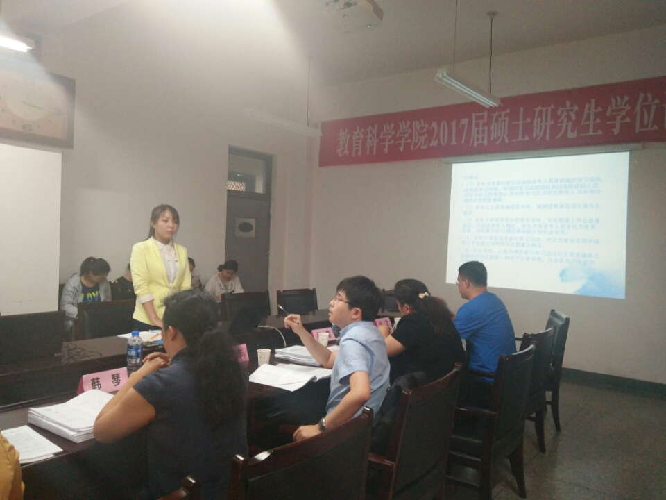 2017年5月14日,太阳成集团tyc122ccvip2017届教育与发展心理学硕士研究生学位论文答辩会在田家炳教学楼五层会议室举行。西安交通大学喻丰教授任答辩委员会主席主持会议,答辩组成员有张潮教授、韩琴教授、肖海雁教授、肖风博士、仝文博士,答辩秘书是谭秀娟助教。心理学一级学科专业员工柏雅颖、李亚婷等11名研究生参加答辩。