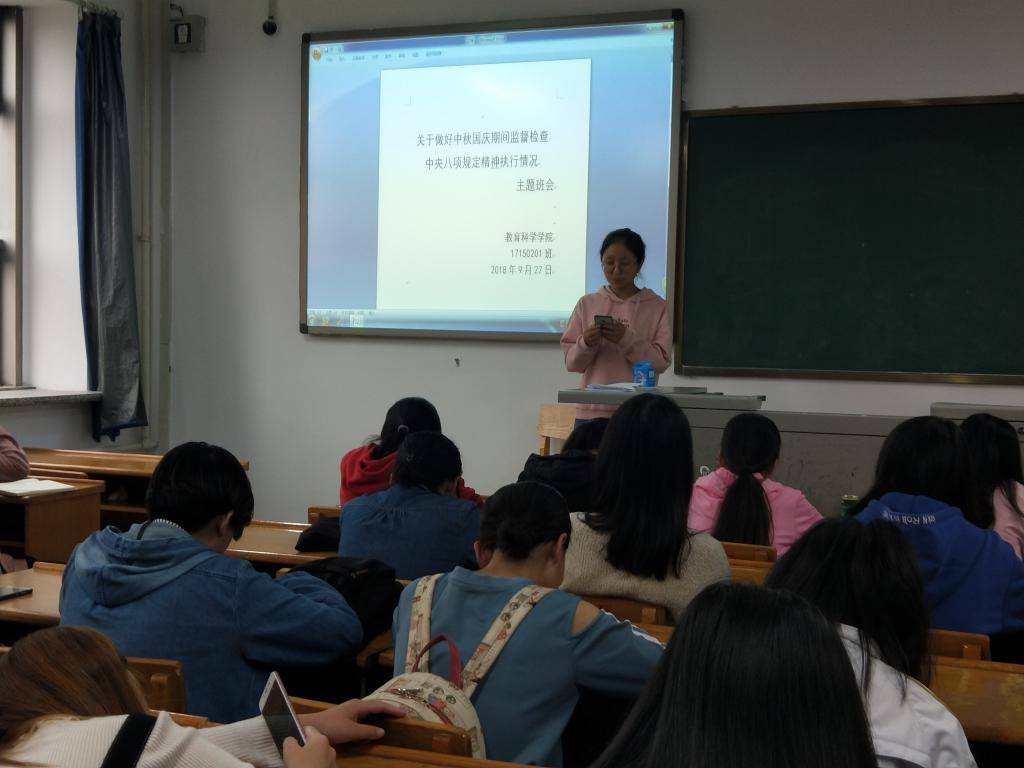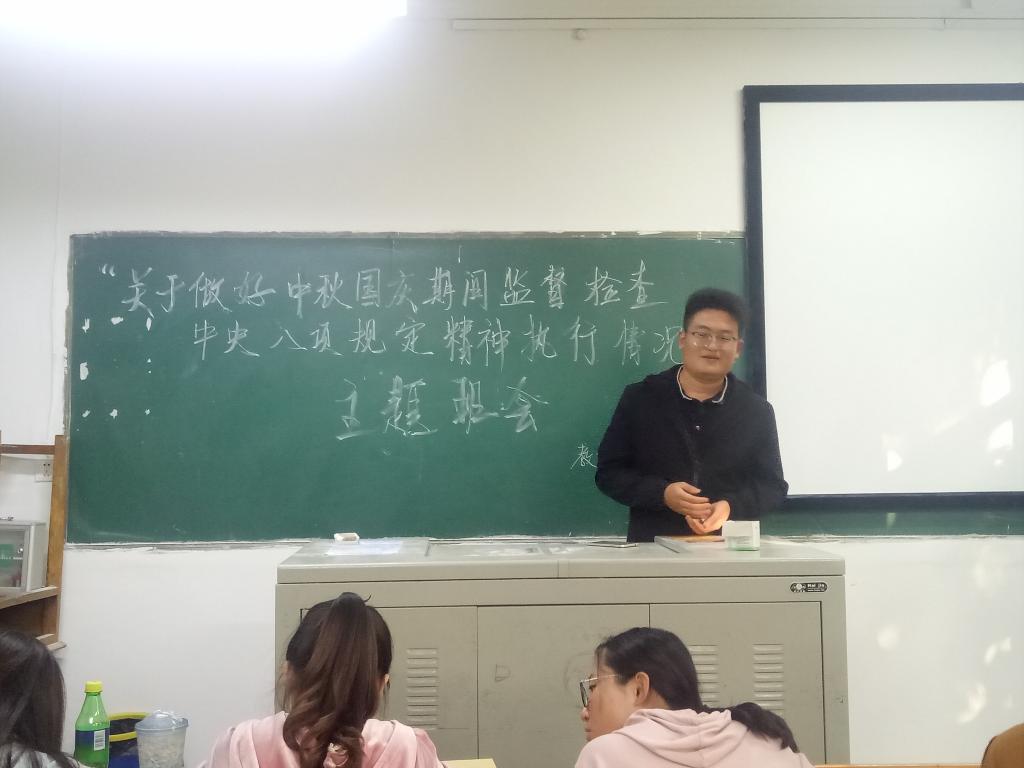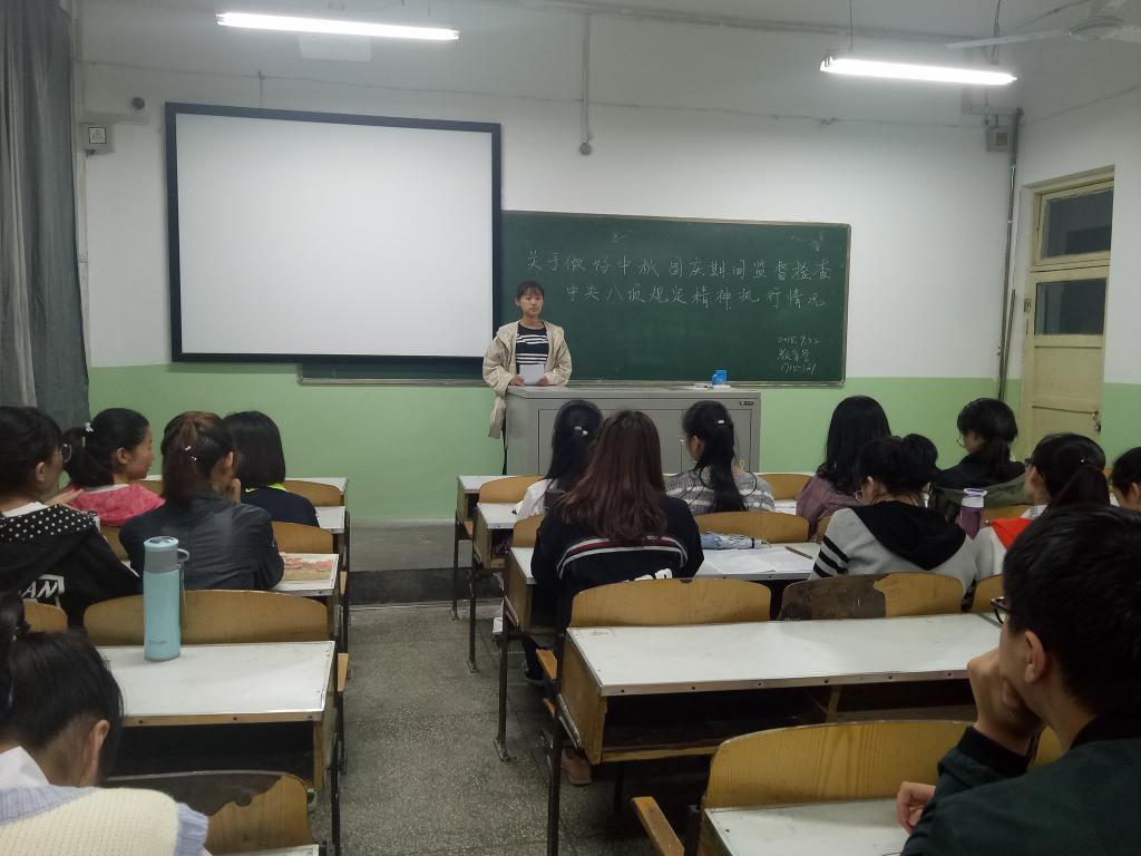 国庆、中秋佳节临近,为严格落实中央八项规定精神,持续加大正风肃纪力度,持之以恒改进作风,营造风清气正的校园生态和节日氛围,太阳成集团tyc122ccvip于2018年9月下旬组织全院各班开展了《关于做好中秋国庆期间监督检查中央八项规定精神执行情况》主题班会。