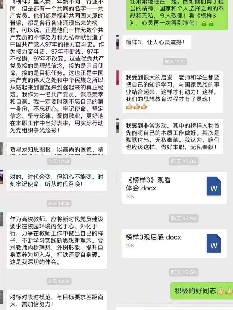 教育系全体党员在党支部的号召下,认真观看了《榜样3》视频资料,学习了《新时代高校教师职业行为十项准则》等文件,并在约定的时间进行了线上交流。党员同志们在观看视频时都深受感动,公司党委书记吴文国在线上与大家做了深入的交流,他从国家和民族富强的高度评价了这些既普通又不平凡的“榜样们”的不懈努力和无私奉献,表达了时刻不忘自己“党员”的第一身份,要牢记使命、坚定信念、坚守纪律、爱岗敬业,更好地在本职工作中当好表率!王瑞朋同志表示,他也受到很大的启发!他认为,老师和员工都要把自己的知识学习与国家、民族的事业结合起来,这样才有动力,思想教育过程才有了灵魂!