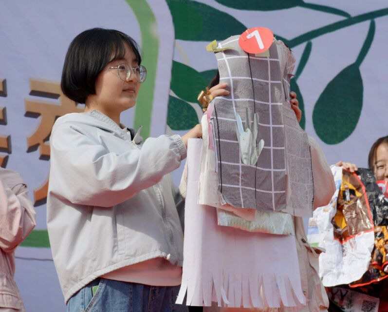 本次校园环保时装秀活动鼓励同学们利用自己的想象力和创造力,改造身边的“废物”,变废为宝。在主持人简单介绍活动背景以及活动规则之后,时装秀拉开了序幕。在服装展示环节,同学们身着精心设计的服装,配合主持人介绍的他们的设计理念,大胆地向观众及评委展示自己的作品,评委也根据他们的设计为他们打分。各式各样的服装赢得了台下观众的阵阵掌声。本次活动服装所用材料都是废报纸、塑料袋、纸壳等等,由此可以看出,参赛者变废为宝的能力以及动手制作的能力非常强。