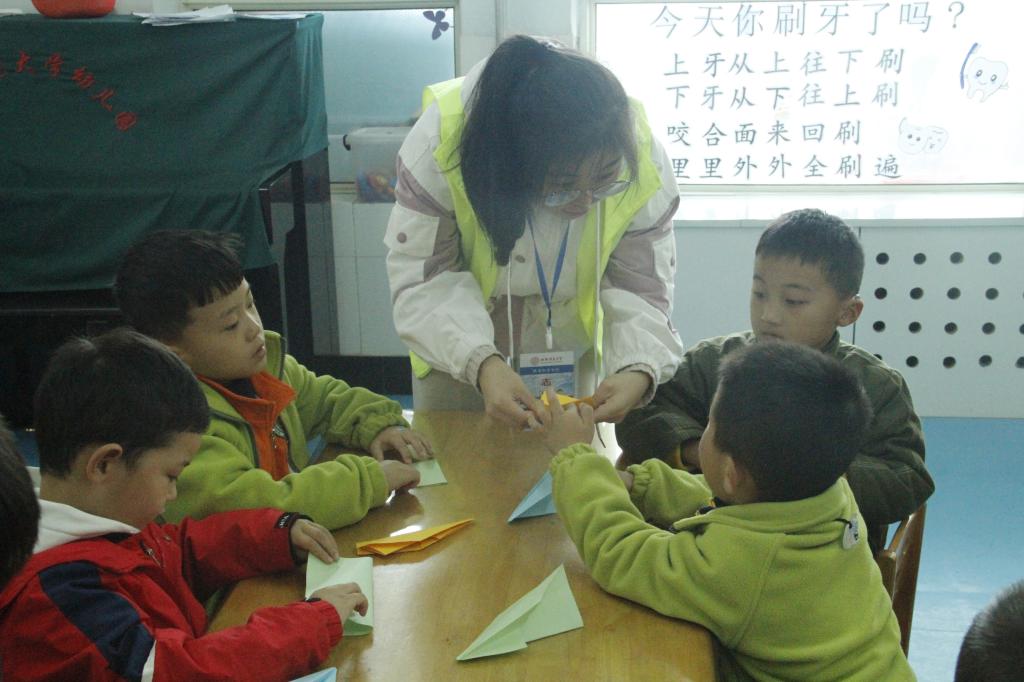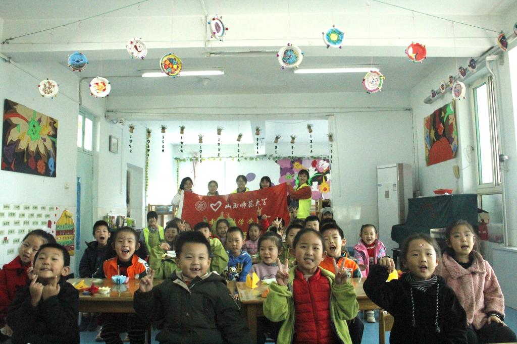 在山西师大幼儿园大二班中,志愿者们依次进行折纸、唱歌和跳舞等趣味活动,游戏与学习紧密结合,锻炼小朋友们独立思考的能力,在与志愿者互动的同时也提高了小朋友们的动手能力。活动最后,志愿者们为每个小朋友送上了精美的礼品,并送上诚挚的祝福。