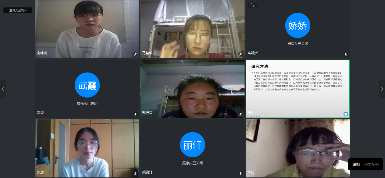为保障开题顺利进行,老师和同学们做了充分的准备,前一天在钉钉群里进行了设备调试,并就开题过程中的可能出现的问题进行了强调。开题报告会开始后,员工们按照学号,依次做个人陈述,陈述的内容主要包括研究目的、意义、框架和重难点,老师们对论文选题、研究方法等方面给出建议。最后,教育史硕士点负责人张迎春老师做总结,并对开题后的论文进展工作进行了安排。