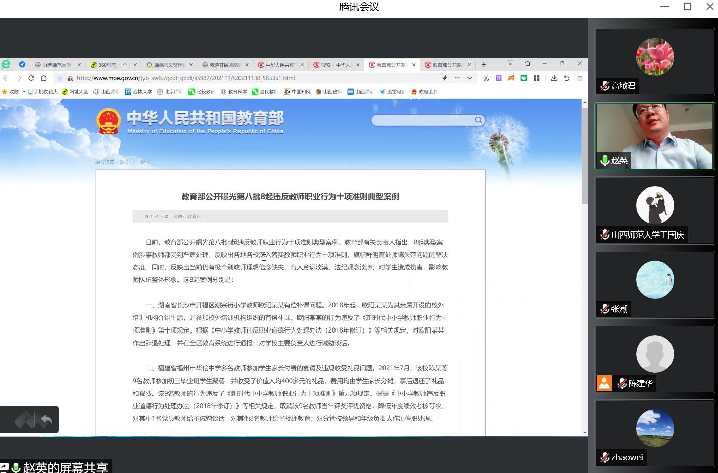 会议传达了教育部公开曝光的第八批、第九批违反教师职业行为十项准则典型案例,重温并强化学习了《新时代高校教师职业行为十项准则》。