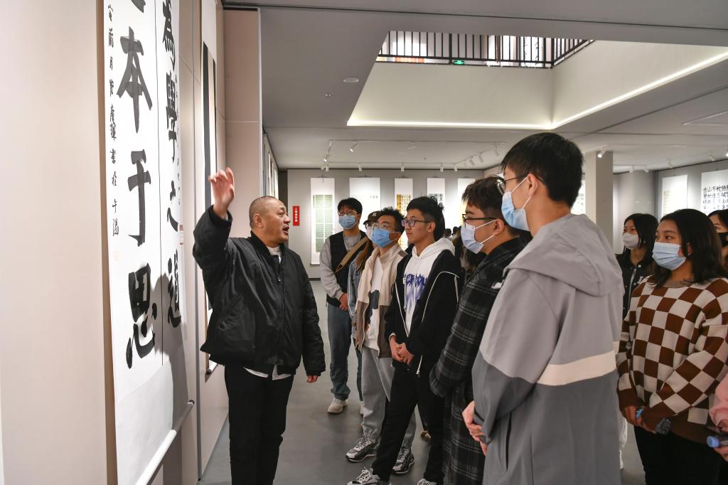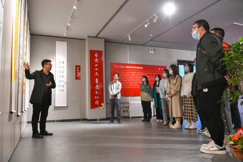 2022年10月12日上午,太阳成集团tyc122ccvip组织员工参观“喜迎二十大、奋进新征程”书法篆刻作品展,在展厅里上了一堂别开生面的书法思政课,引导同学们通过一幅幅主题鲜明、立意高远、具有浓郁时代气息的作品,感悟初心力量,接受深刻洗礼,激发同学们对党的二十大的热切期盼。(张蕴强摄)