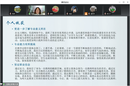 通过一个学期的实习,同学们对何为教学、何为教育有了更深刻的认识,在更加热爱员工,热爱教师职业的同时,深切体会到要成为一名优秀的教师还有很多东西需要学习。通过参与教学实践,同学们认识到自己在知识积累、技能掌握、能力发展等方面的不足,对自己未来的发展有了更清晰的思考和定位。实习汇报活动给同学们提供了交流经验、分享感悟的平台,取得了圆满成功。