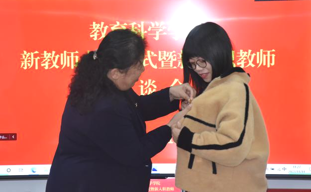 会议首先举办新教师入职仪式,张潮经理为新入职教师佩戴校徽,赵英书记向新教师赠送入职礼物。