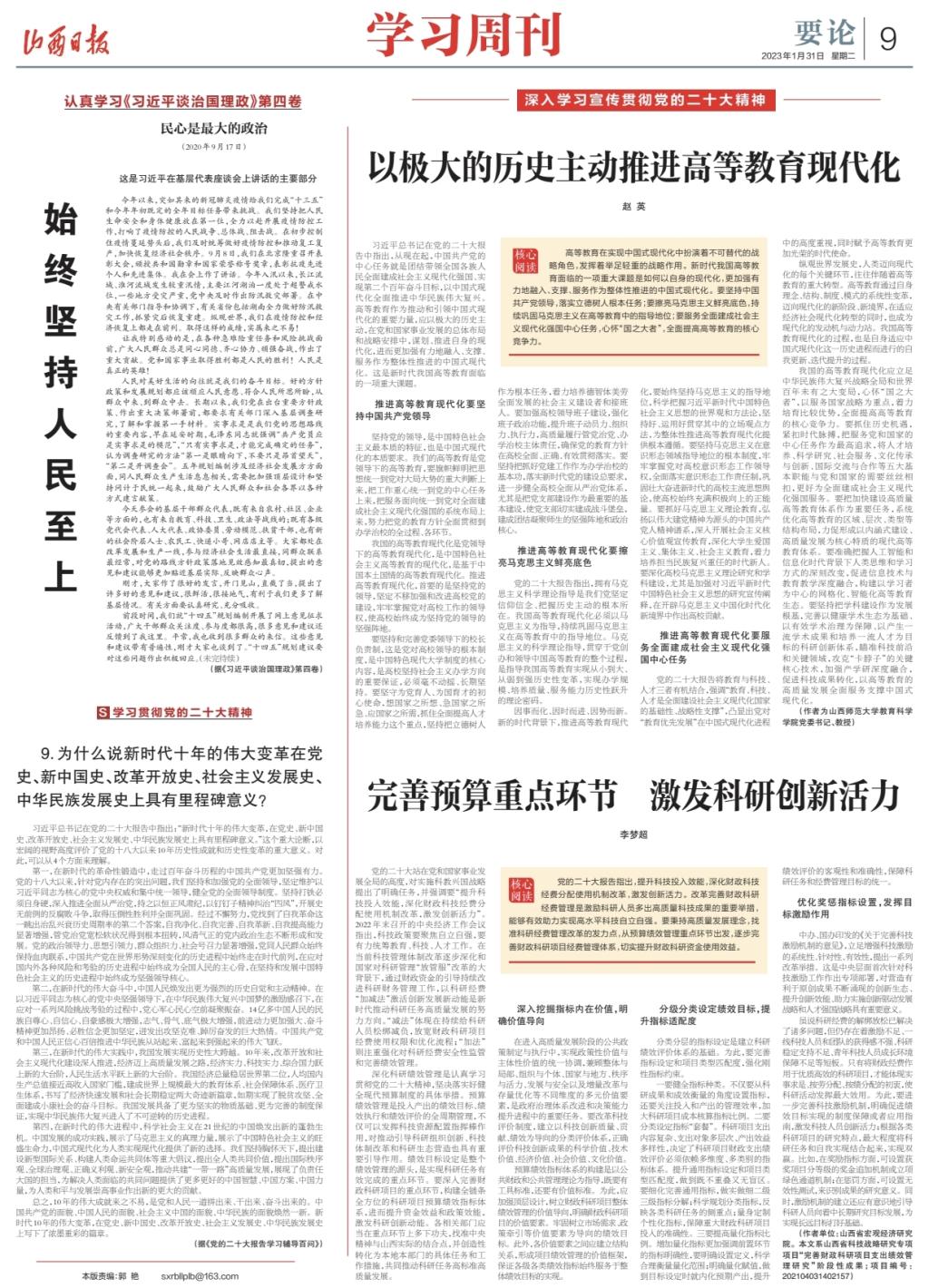 1月31日,《山西日报》“要论版”刊发了公司党委书记赵英署名文章:以极大的历史主动推进高等教育现代化。文章指出:高等教育在实现中国式现代化中扮演着不可替代的战略角色,发挥着举足轻重的战略作用。新时代我国高等教育面临的一项重大课题是如何以自身的现代化,更加强有力地融入、支撑、服务作为整体性推进的中国式现代化。要坚持中国共产党领导,落实立德树人根本任务;要擦亮马克思主义鲜亮底色,持续巩固马克思主义在高等教育中的指导地位;要服务全面建成社会主义现代化强国中心任务,心怀“国之大者”,全面提高高等教育的核心竞争力。