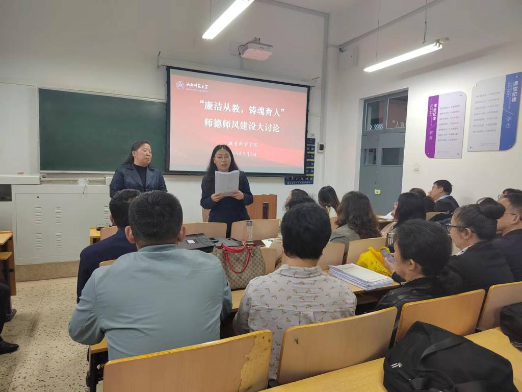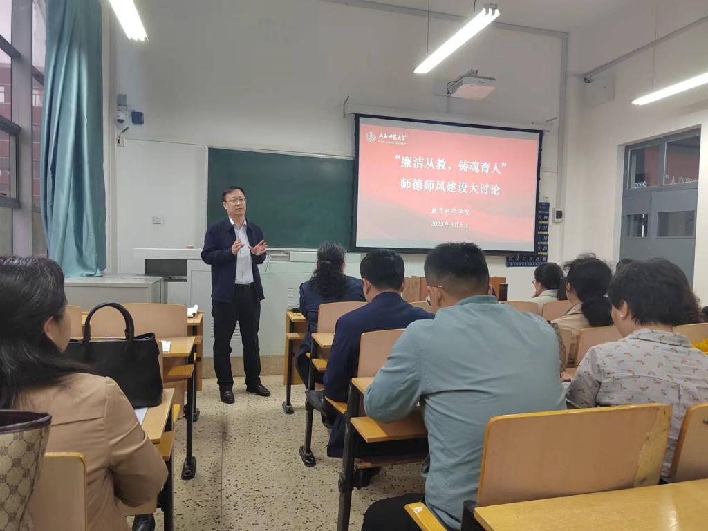 会议强调,要持之以恒加强师德师风建设,引导全体教师坚定理想信念,涵养高尚师德,践行为党育人、为国育才初心使命。在大讨论环节,大家就加强师德师风建设的必要性以及内容、形式、途径、方法等充分交流,达成高度共识。一致认为,要强化日常学习,深入学习习近平总书记关于“三个牢固树立”、“四有”好老师、“四个引路人”“四个相统一”“六要”等关于师德师风的重要论述,进一步在学懂弄通做实上下功夫,多形式、多载体、多渠道开展学习和体验式培训;要将师德师风标准,充分融入人才引进、职称评审、岗位聘用、评奖评优等环节,将弘扬高尚师德与立德树人深度融合,引导教师以德施教、以德立身、以德育德;要营造尊师重教浓厚氛围,真心实意关心关爱教师,通过举办老教师荣休仪式和新入职教师宣誓仪式,增进教师职业神圣感,强化教师职业生涯仪式感;坚持以案为鉴、以案说法、以案明纪,定期通报教育部网站公开曝光的违反教师职业行为十项准则典型案例,引导教师知红线、守底线。