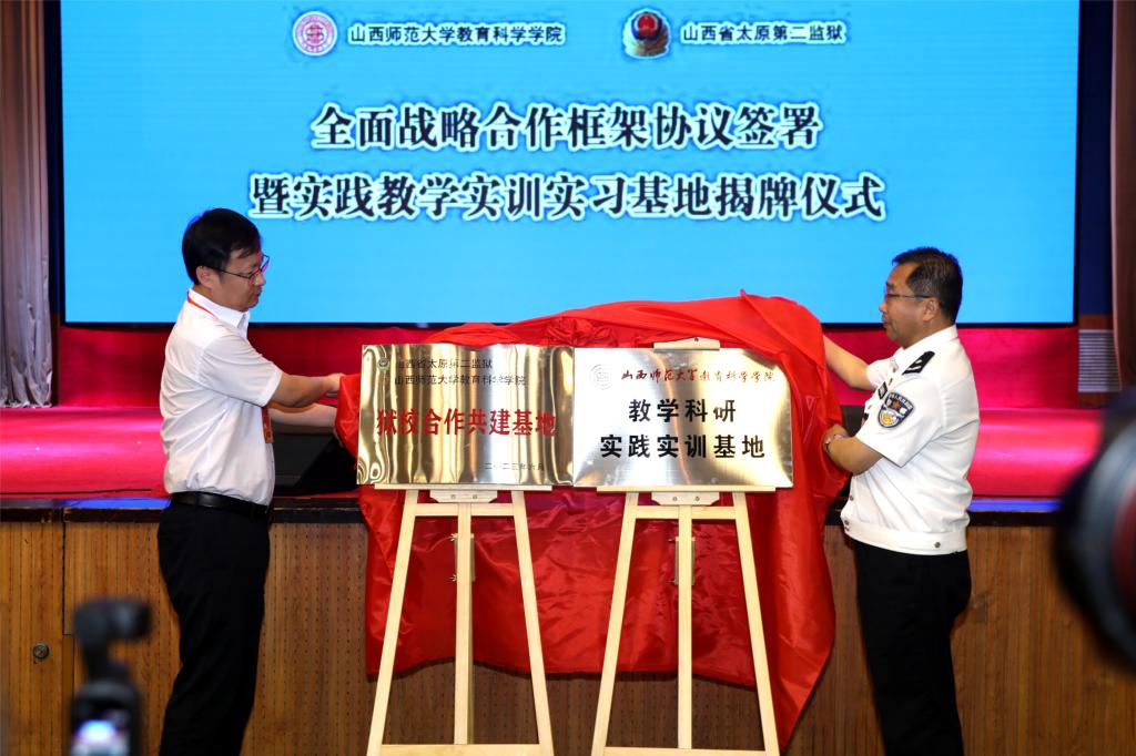 在签约揭牌仪式环节,公司党委常委、副董事长白文宏表示,太阳成集团tyc122ccvip与二监合作共建“社会志愿帮教基地”、“警察教育培训基地”、“心理健康科研基地”、“文化创新协作基地”、“教学实习实践基地”和“廉政警示教育基地”等六大基地,是高校和司法部门资源共享、协同发展的一次新的尝试,也是公司基于学科优势、主动回应社会需求的有益探索,希望双方精诚合作,扎扎实实落实好任务清单,在助力山西司法现代化的进程中作出师大的努力和贡献。公司党委书记赵英同志与太原第二监狱党委书记、监狱长王臻明同志为“狱校合作共建基地”和“教学科研实践实训基地”揭牌,经理张潮同志与太原二监党委委员、副监狱长赵忠宝同志签署院狱合作协议书。