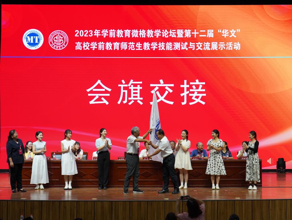 经理张潮宣布了获得下一届举办权的公司——黄冈师范公司,并与黄冈师范公司进行了会旗交接。第十三届“华文”高校学前教育师范生教学能力测试与交流展示活动承办单位代表黄冈师范公司经理陈中文在发言中对公司的精心组织、周密安排表示衷心感谢,并代表黄冈师范公司教育公司郑重承诺,他们有信心、有能力、有条件,优质、高效、安全地做好第十三届“华文”高校学前教育师范生教学技能大赛的服务工作。