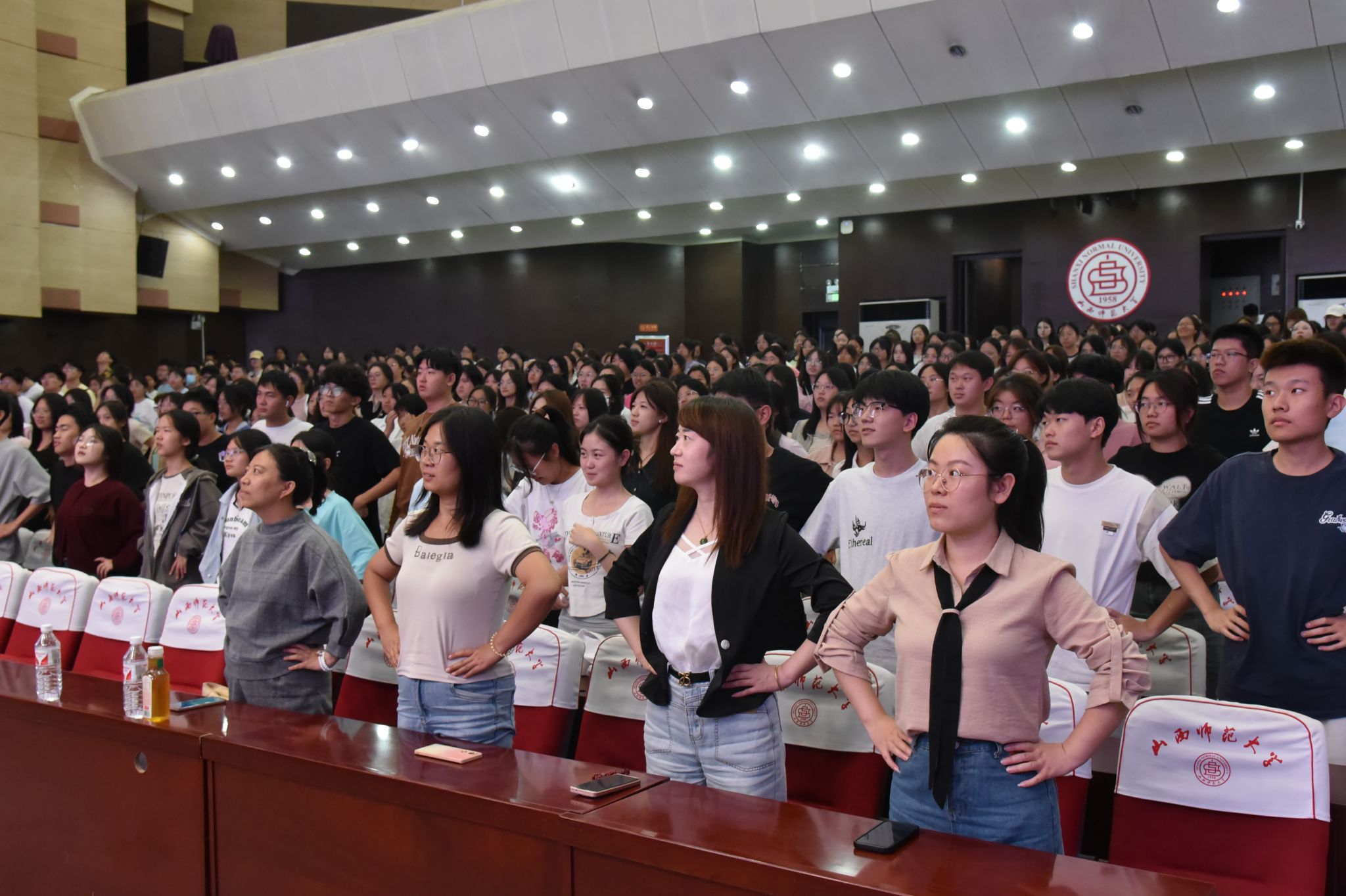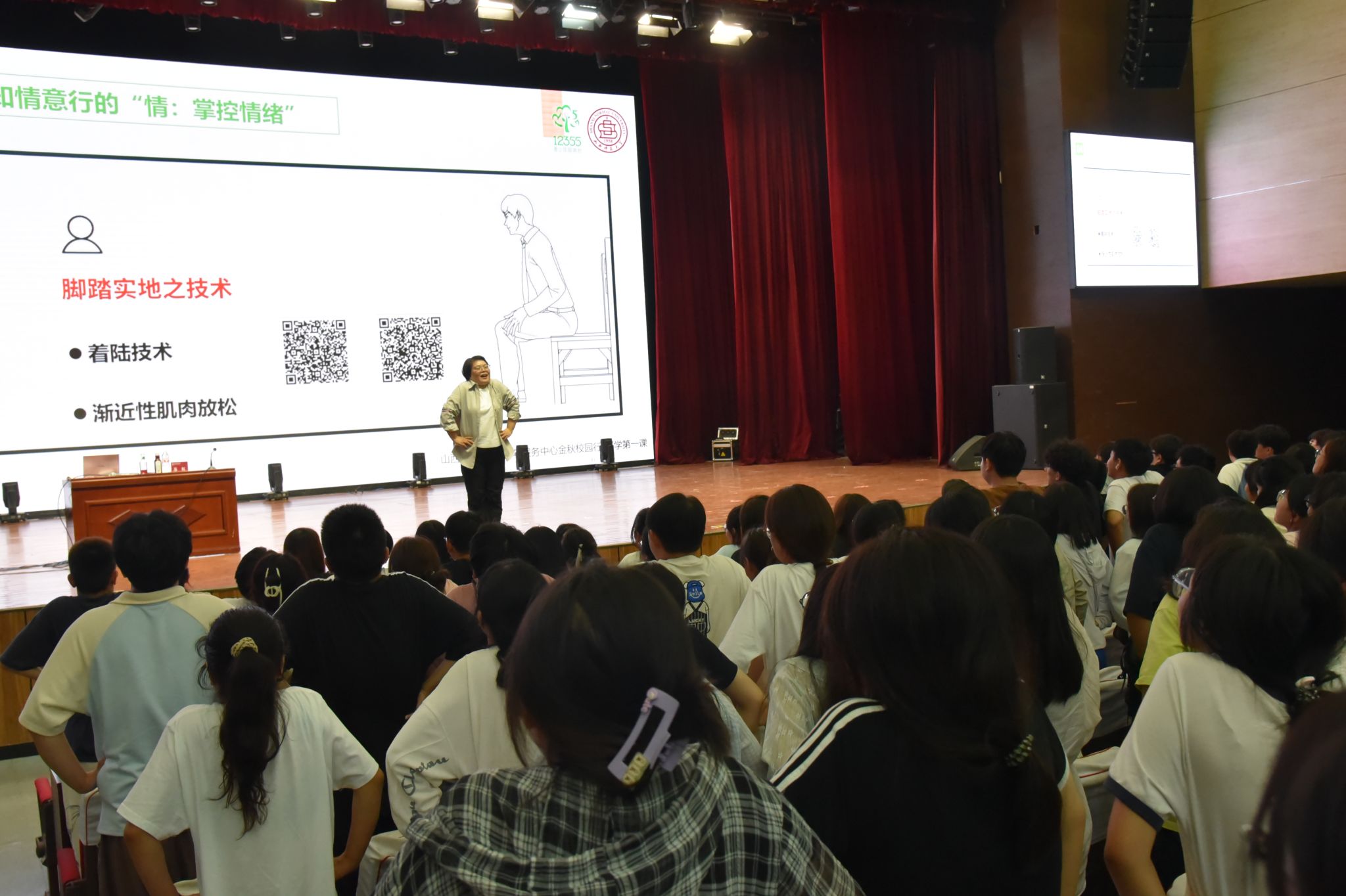 苏虹以“神秘的心理学”“心理健康”“大学大不同”“知情意行”四个独特视角带领与会师生走进心理健康,以提问、分享、心理小游戏等方式,引导同学们通过悦纳自我、掌控情绪、规划发展、和谐人际四部曲找到真实的自我。她专业的知识和富有感染力的讲解,吸引着在场的每一个同学。同学们积极参与到腹部呼吸法、肌肉放松法等情绪调节方法的练习中,现场气氛轻松且热烈。最后,苏虹向新生们送上了祝福,希望同学们做到“阅己、越己、悦己”,在未来的四年中越来越好。