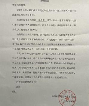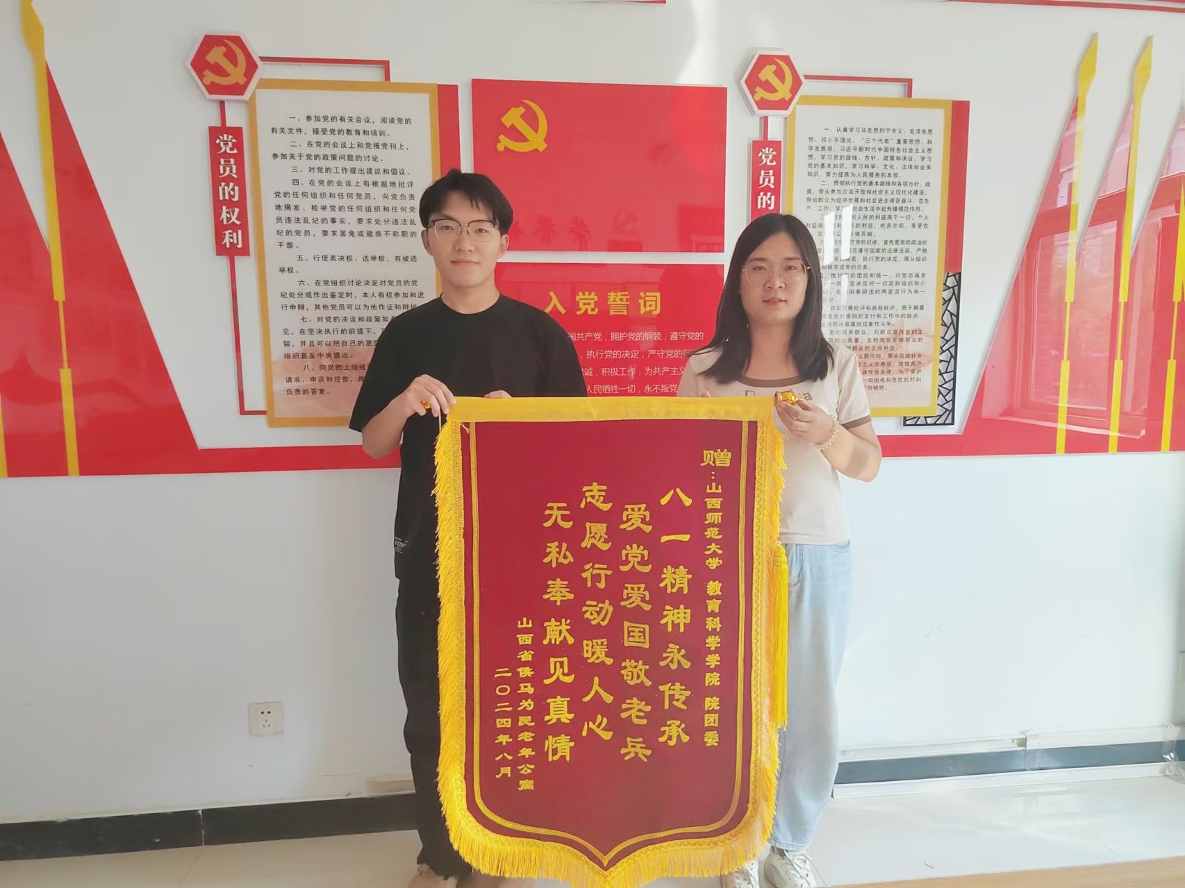 日,公司团委收到了一份特殊的礼物,是山西省侯马为民老年公寓送来的一面写有“八一精神永传承 爱党爱国敬老兵 志愿行动暖人心 无私奉献见真情”的锦旗。