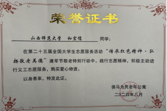 今年8月,公司23150201班员工和宏儒,在暑期“三下乡”活动中,赴山西省侯马市为民老年公寓参加了为期一个月的“传承红色基因,弘扬敬老美德”暑期社会公益建军节敬老特别行动,照顾因公伤残转业的老兵们的生活起居、宣传健康知识、倾听他们的心声等,用实际行动为他人、为社会作贡献。他任劳任怨、无私奉献,受到了老兵们的一致好评。在实践的过程中,他深刻体会到了服务他人的成就感和责任感,希望通过自己的努力,带动身边的人一起投入到志愿服务当中,正如他在日记中写到的“我也真想成为像陈祥榕、黄文秀这样优秀的青年和共产党员”的愿望。