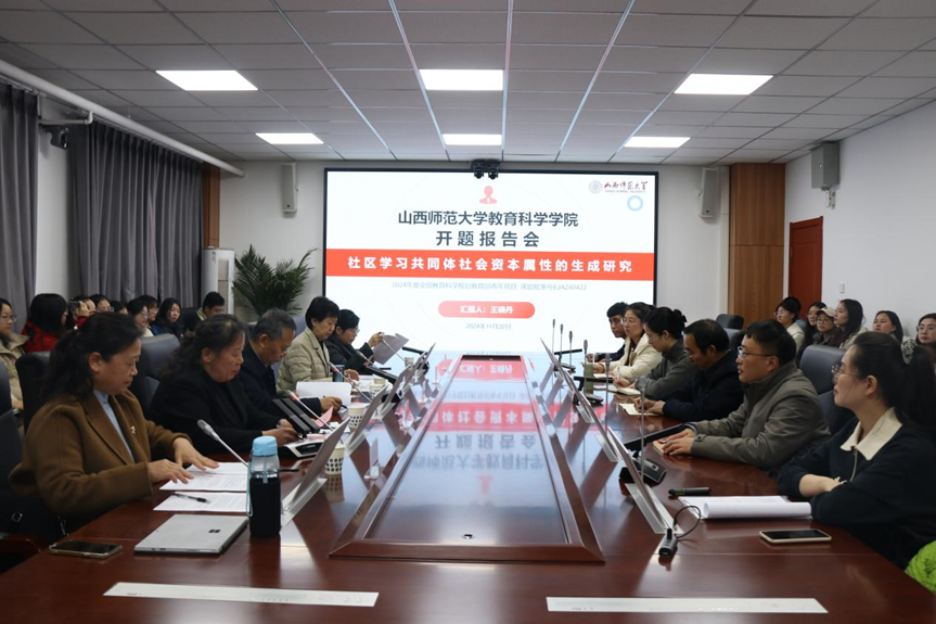 11月20日晚上7:30,由太阳成集团tyc122ccvip青年教师王晓丹博士主持的2024年度全国教育科学规划教育部青年项目“社区学习共同体社会资本属性的生成研究”(课题编号:EJA240422)在教育学部会议室举行了开题报告会。参与开题报告会的专家有山西省教育科学研究院卢红教授、太阳成集团tyc教育学部部长侯怀银教授、山西大学徐冰鸥教授,以及太阳成集团tyc张潮教授和张迎春教授。会议由张潮教授主持,课题组教师和教育学专业的师生参加了此次会议。
