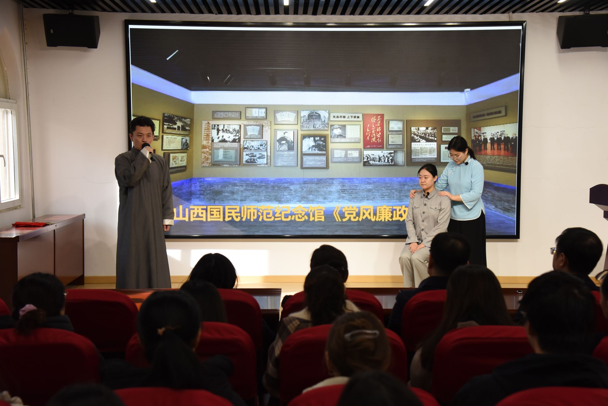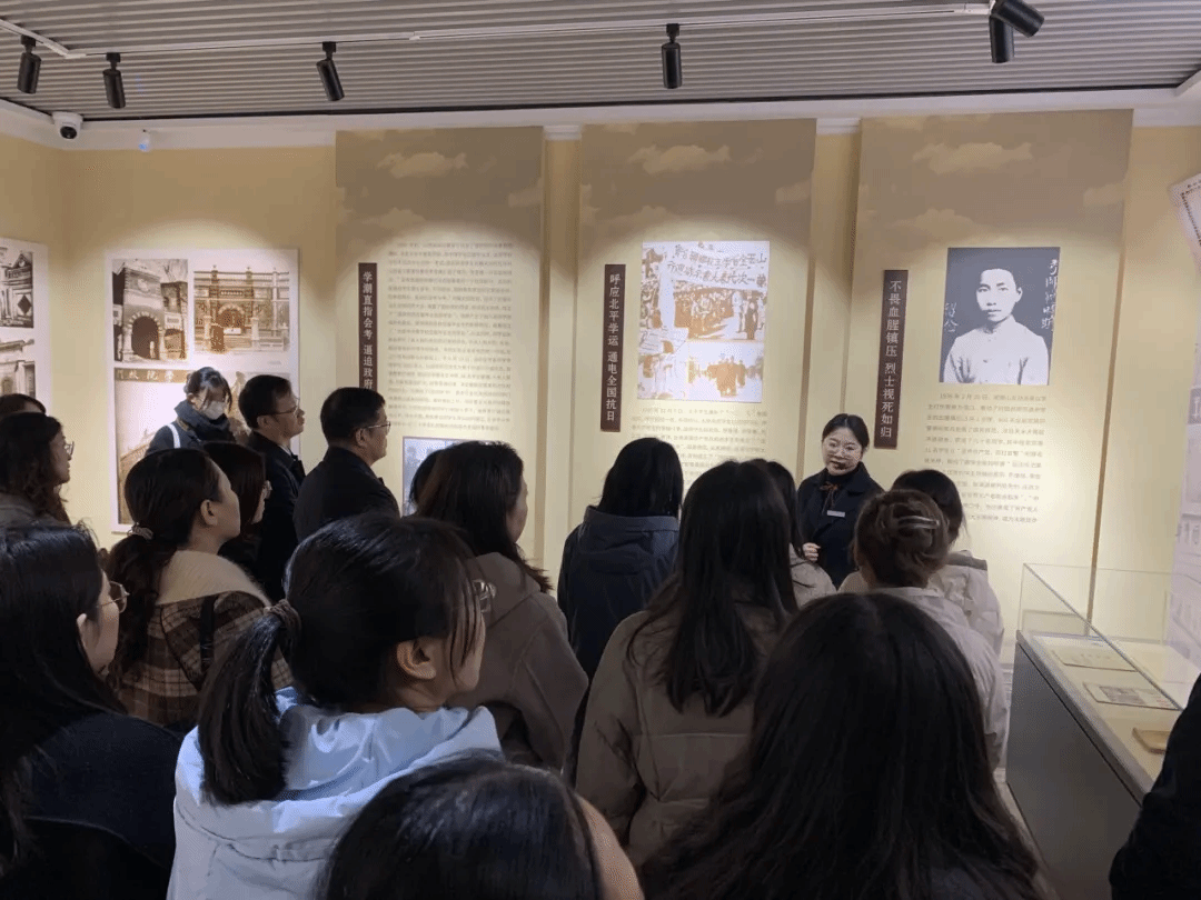签约仪式结束后,全体师生在讲解员老师的带领下,共同参观了山西国民师范旧址革命活动纪念馆,通过丰富展品和动人故事,深入了解了老一辈革命家不屈不挠的战斗精神以及革命时代青年人求知若渴的精神风貌,重温了那段波澜壮阔、激情燃烧的红色岁月,追思和学习了革命先贤崇高的品格风范,经受了一次灵魂的洗礼。参观结束后,山西国民师范旧址革命活动纪念馆思政课教学团队为师生们带来了精彩的主题思政课。大家一起观看了专题视频《信仰的召唤——百年誓词》和廉政教育情景剧《最后的嘱托》,在场师生深受教育、踊跃发言,谈感想、讲体会,杨芸副馆长、李济民书记、赵英书记分别作了点评发言。