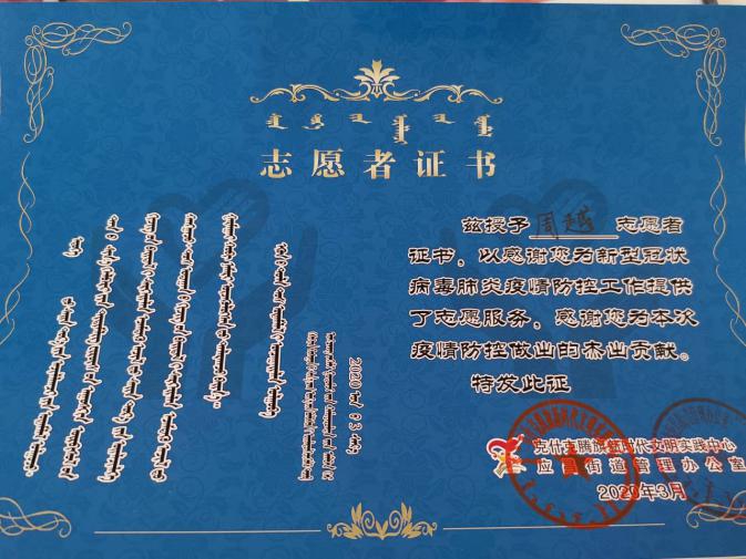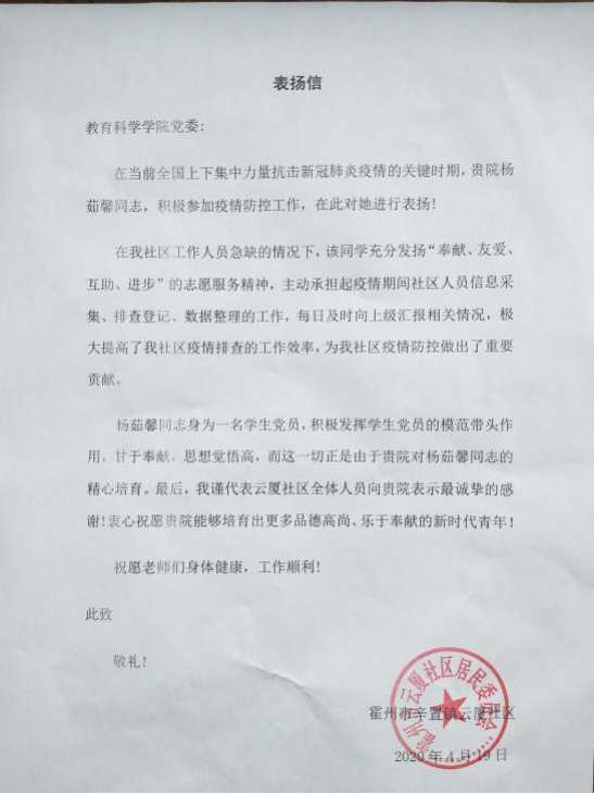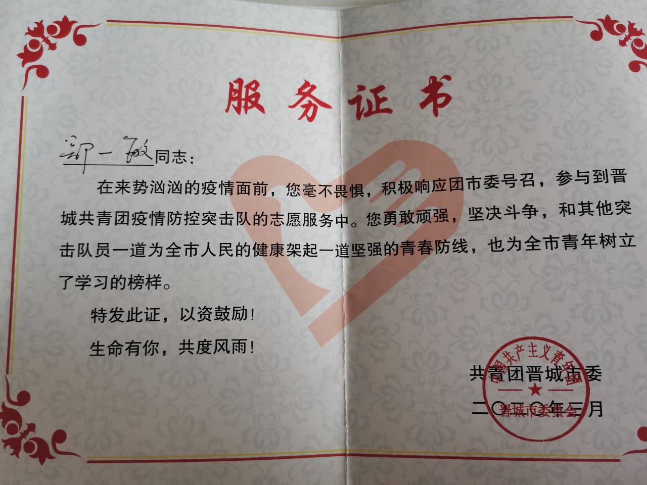 公司“心研社”党支部的员工党员在疫情期间不忘党员使命,积极主动地参与疫情防控志愿者服务工作,践行了新时代的党员精神,彰显了新时代共产党员的责任担当和青春使命。赵媛媛、张艺、华凯婷、张荣、郑一敏、周越等同学加入疫情防控志愿者队伍,在工作中认真负责,服从安排,完成了多项志愿工作,为防控工作做出了贡献,传递了抗“疫”正能量。一些基层团组织、村委会或居委会为他们发来了表扬信或荣誉证书,对他们的工作表示认可和赞扬。
