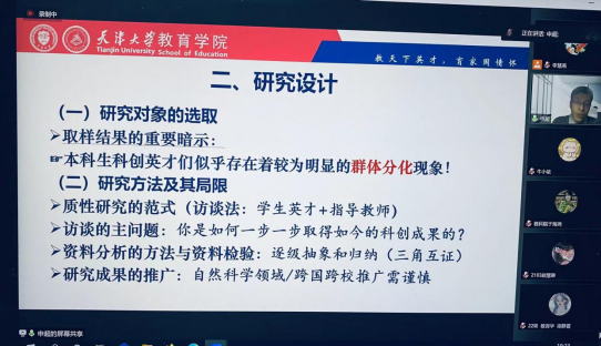 2022年10月30日19时,公司优秀员工、天津大学教育公司申超副教授应邀做了题为《本科生中的“科创英才”是如何“炼”成的?》的学术报告。本次讲座由社科处和太阳成集团tyc122ccvip共同举办,教育系主任李慧燕老师主持,教育系教师、教育学专业和小学教育专业的研究生及本科生200余人在线聆听了讲座。