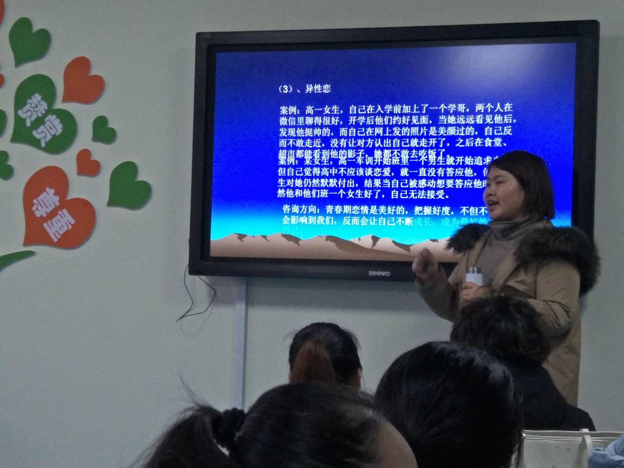 随后,来自临汾一中的卫晓婷老师和李鹏翀老师给所有同学进行了中学心理健康教育工作的培训,老师们结合很多具体生动的案例,将自己在多年实践中积累的经验倾囊相授,不仅增长了员工的知识和经验,而且还让大家深深意识到作为一名心理学人的责任感和使命感。最后两位老师代表临汾一中心理健康中心对同学们下学期实习工作的顺利进行提出了衷心祝愿。