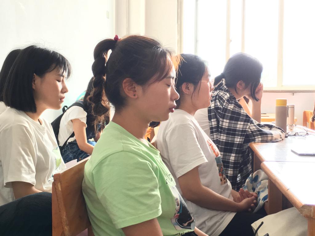 活动伊始,主持人带领同学们观看了一段介绍冥想的视频,帮助大家进一步了解冥想,并为接下来的冥想奠定了基础。为了增强活动体验,主持人向大家介绍了一些冥想的小技巧,如放慢呼吸、放松身体等。在冥想环节中,同学们跟随引导进行深呼吸,恰当运用技巧,想象自己正处在美丽的大自然中,最大程度地放松自己。在活动的最后,同学们互相交流、分享经验。