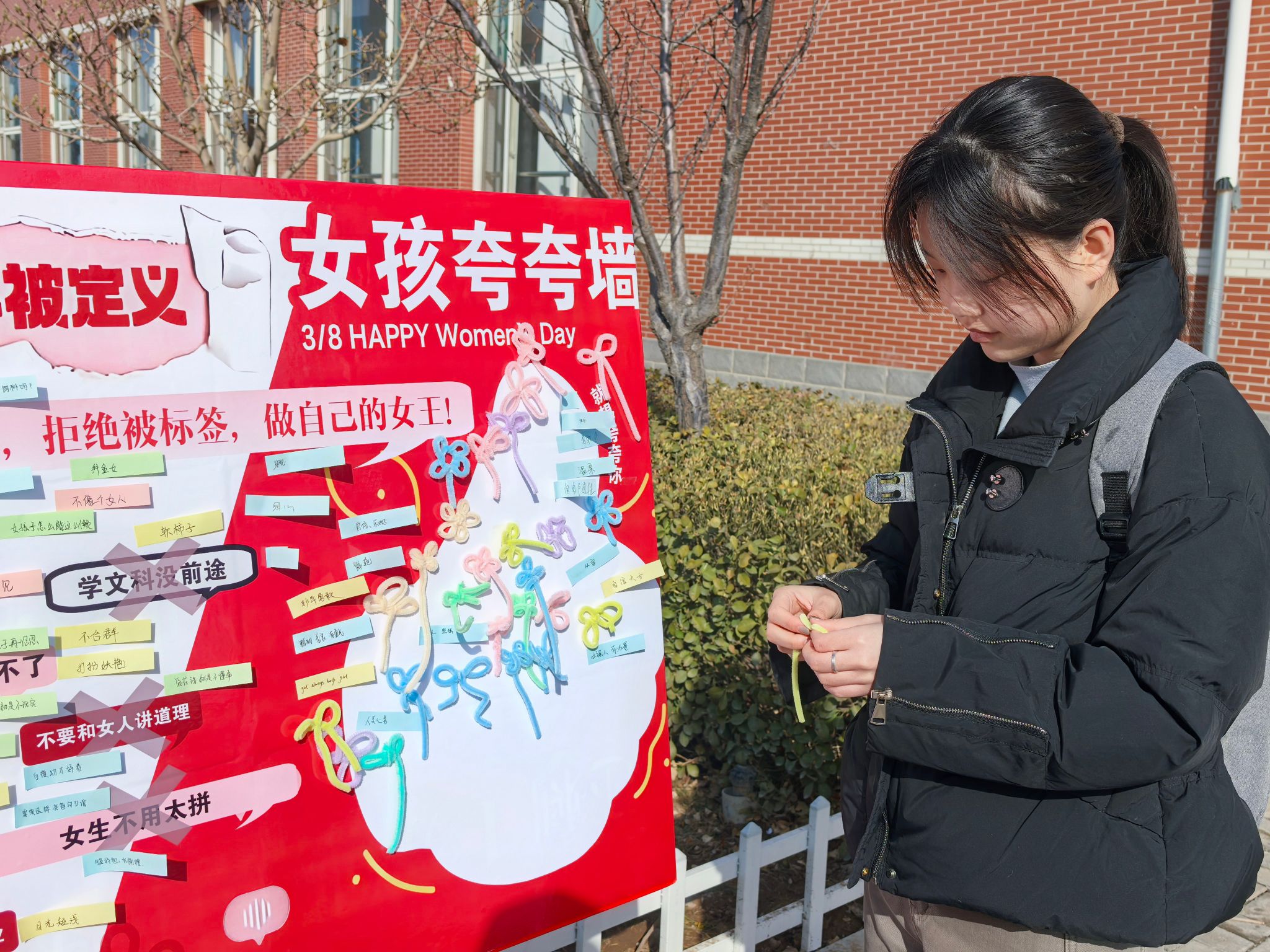 活动现场设置了丰富的互动环节。在志愿者引导下,同学们撕碎写有性别偏见的标签;通过词语配对游戏打破刻板印象;并分享巾帼榜样的感人故事。活动在轻松温暖的氛围中引导大家正视自我、绽放光芒,进一步营造了尊重女性力量、致敬巾帼风采的校园氛围。(青年志愿者协会/文 徐愿 张好/图)