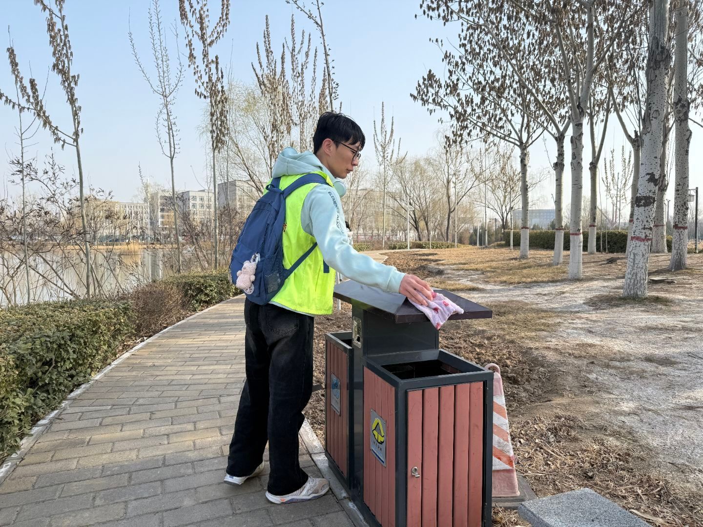 活动中,志愿者与参与同学分工协作,认真清理路面杂物、擦拭公共设施、规整乱停车辆、清除卫生死角。现场大家干劲十足、配合默契,俯身劳作的身影成为校园里一道亮丽的风景线。此次活动不仅改善了校园环境,更让同学们在实践中体会到了奉献与担当,让雷锋精神在新时代的志愿服务中薪火相传。(文/张佳蓉)