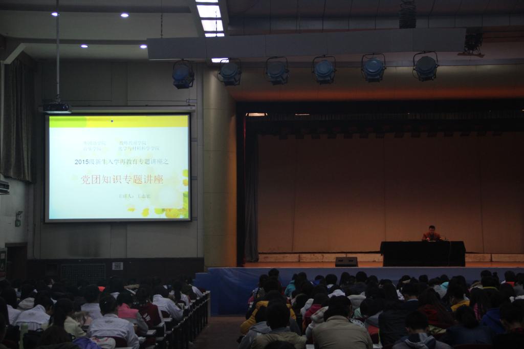 11月5日、6日晚7点,教师教育公司、外国语公司、音乐公司和化学与材料科学公司在员工文化艺术活动中心联合举办了2015级新生入学教育第二次专题讲座。本次讲座共分为两个专题,分别从党团知识、安全知识两方面指导新生尽快地适应大学的学习与生活。