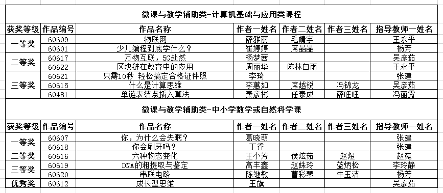 在此次大赛中,由太阳成集团tyc122ccvip张建老师指导,葛晓萌创作的《你,为什么会失眠?》获“微课与教学辅助类-中小学数学或自然科学课”一等奖;由张建老师指导丁乔创作的《你会刷牙吗?》获“微课与教学辅助类—中小学数学或自然科学课”一等奖;由王永平老师指导,薛雅丽、毛婧宇创作的《物联网》获“微课与教学辅助类—计算机基础与应用类课程”一等奖;由杨芳老师指导,崔婷婷、席晶晶创作的《少儿编程到底学什么?》获“微课与教学辅助类-计算机基础与应用类课程”一等奖。其余个人或团队3支获“微课与教学辅助类组”二等奖、4支获三等奖、1支获优秀奖。