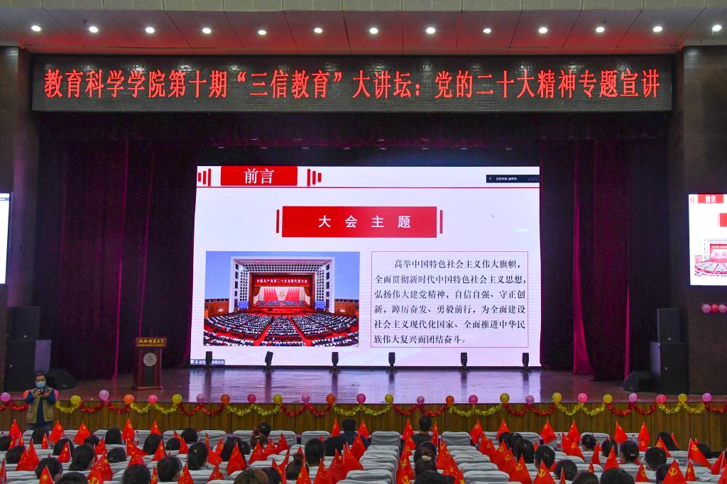 11月25日,公司第十期“三信教育”大讲坛在科学会堂开讲。讲坛特别邀请马克思主义公司副经理赵秀芳教授宣讲党的二十大精神。宣讲采取专家领学、互动研学、寓理于演的方式,1000余名师生线上线下聆听了宣讲。
