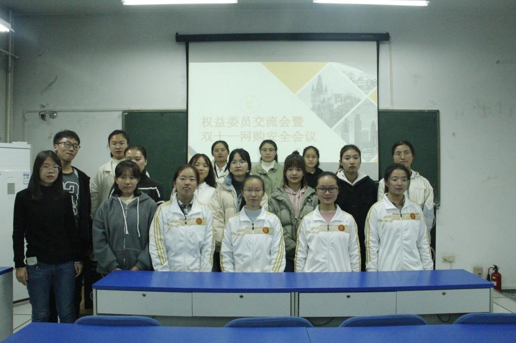 会议伊始,王炯婕介绍了本次会议的举办目的与流程,会议分为权益委员交流和"双十一"网购安全教育两部分。在第一环节中,各班权益委员就如何做好权益工作进行交流并分享了心得体会,交流期间,权益委员们讨论热烈,现场氛围良好。在双十一网购安全教育环节中,王炯婕通过"双十一"网购安全的相关案例分析、播放相关视频等方式,向同学们强调了网购的注意事项,进一步提高员工的维权意识。合影留念后,此次会议结束。