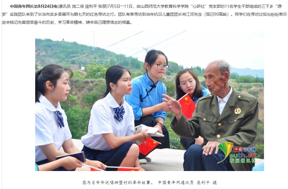 9月24日,国内最大的青年主流媒体“中国青年网”集中报道了公司“心研社”党支部暑期“三下乡”的活动盛况。近年来,公司党委积极打造“党旗领航社团群”党建品牌,即强力推进以“心研社”党支部为引领的,以“心研社”社团为主体的“社团群”建设,取得了阶段性成效,在公司“立德树人”的办学实践中发挥了重要作用。此次暑期“三下乡”红色寻访社会实践活动进一步丰富了党建工作的内涵,拓展了思想教育的领域,是公司党建和思想政治工作继4月“心研社”团支部被共青团山西省委授予“全省五四红旗团支部” 荣誉称号、5月《人民日报》“有品质的新闻”栏目以崭新的视角报道“心研社”喜迎中华人民共和国成立70华诞暨成立25周年系列活动、6月《中国日报》中文网以图文并茂的形式报道“心研社”党支部“过好政治生日,坚定信仰信念”主题党日活动之后的又一标志性工作成果。