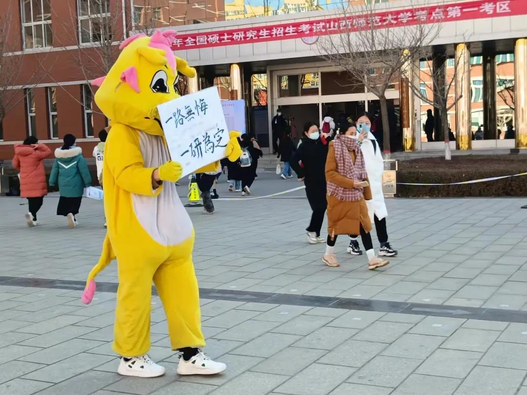 活动前期,志愿者们手工制作手立牌。考生进入考场前,在不影响进场秩序的前提下为考生加油,点滴祝福化为他们考场上的动力。活动过程中,身穿黄色小龙玩偶服饰的志愿者为考生送上温暖的拥抱与简短鼓励的话语。